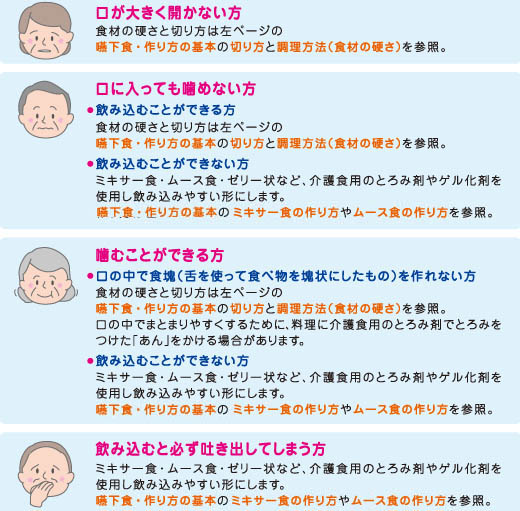 食べる人の様子に合わせた、食材の加工方法(硬さ・切り方・とろみ)